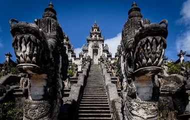 Tanah Lot temple is one of the most well-known temples in Bali. Located in west Bali, many tourists visit it for its magnificent view and unique location. This small temple is nestled on a small piece of land off the coast and is only accessible during low tide. It's a 30-minute drive northwest of Kuta, and is well worth the drive. Many visitors, both locals and tourists alike come here to be blessed by the holy water from the Tirta Pabersihan fountain.