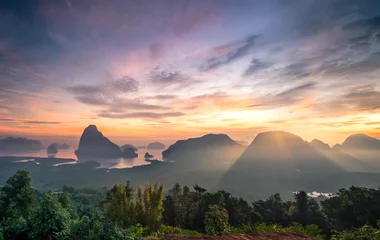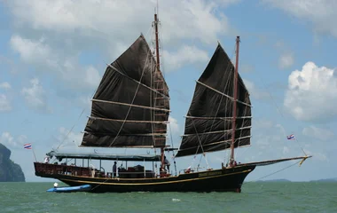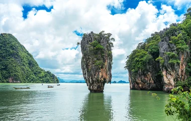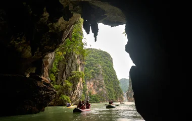 Phang Nga Bay is a bay in the Strait of Malacca between Phuket island and the mainland of southern Thailand. It's 400 square kilometres big with 42 islands, consisting of numerous limestone cliffs and cave systems. Large sections of the bay have been designated as a part of the Ao Phang Nga National Park since 1981 to protect the natural ecosystem.